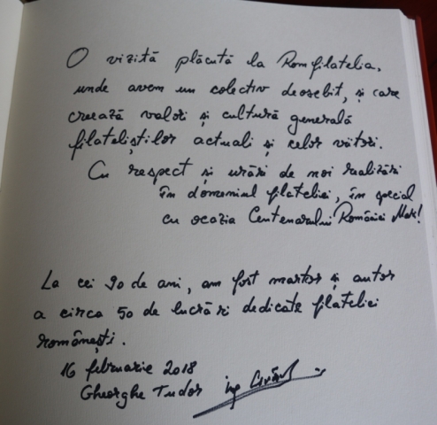 În încheierea vizitei, filatelistul Gheorghe Tudor a semnat cartea de onoare a societății: „O vizită plăcută la Romfilatelia, unde avem un colectiv deosebit și care creează valori și cultură generală filateliștilor actuali și celor viitori. Cu respect și urări de noi realizări în domeniul filateliei, în special cu ocazia Centenarului României Mari! La cei 90 de ani, am fost martor și autor a circa 50 de lucrări dedicate filateliei românești”.