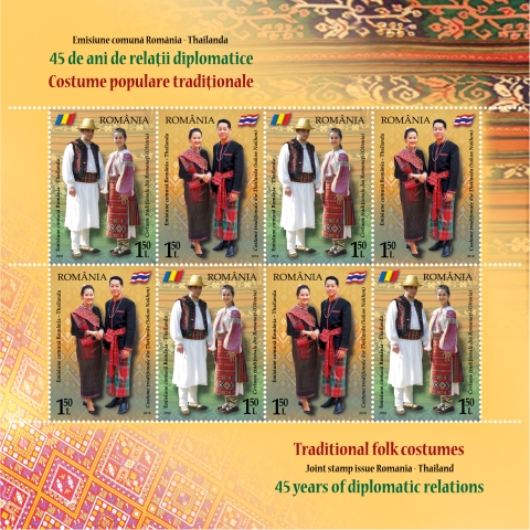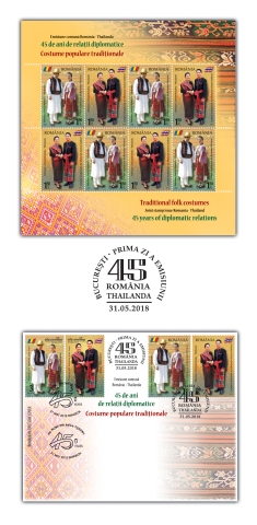 Continuând seria emisiunilor filatelice dedicate relațiilor diplomatice și cu ocazia aniversării relațiilor bilaterale dintre România și Regatul Thailandei, stabilite la data de 1 iunie 1973, Romfilatelia introduce în circulație emisiunea comună de mărci poștale România-Thailanda, 45 de ani de relații diplomatice, având tematica Costume populare tradiționale.