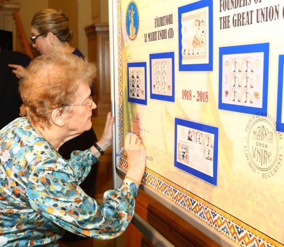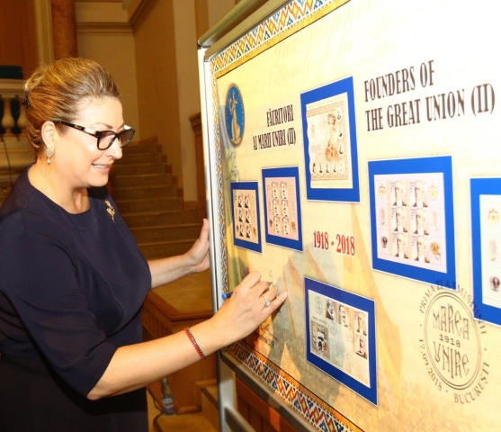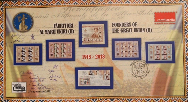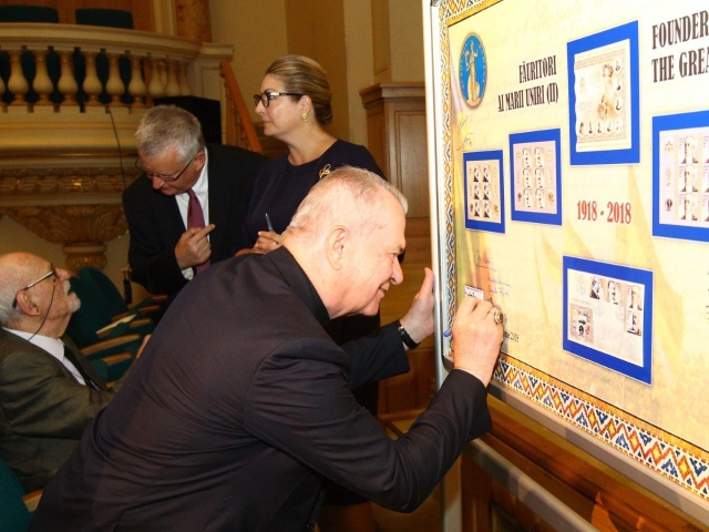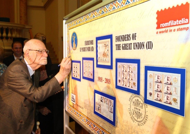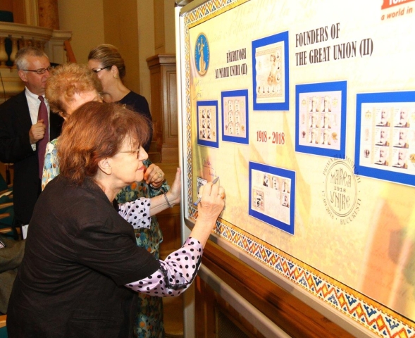 La finalul sesiunii de comunicări științifice, Directorul General al Romfilatelia a invitat oficialii prezenți la eveniment să lanseze emisiunea filatelică aniversară prin dezvelirea și semnarea panoului filatelic „Făuritori ai Marii Uniri (II)” sub deviza „Celebrăm Centenarul Marii Uniri. Cinstim valorile României.”