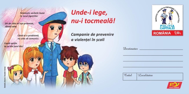 Vă reamintim că în luna martie, Romfilatelia a introdus în circuitul poștal un întreg poștal având ca temă combaterea violenței în școli. Întregul poștal poartă mesajul „Unde-i lege, nu-i tocmeală!”, acesta fiind, de altfel, titlul primului proiect de educație juridică din România inițiat de Poliția Capitalei în anul 2008.