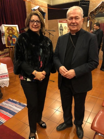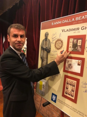 Doamna Cristina Popescu, director general Romfilatelia, a mulțumit episcopilor catolici pentru onoarea de a prezenta emisiunea de mărci poștale Vladimir Ghika, 5 ani de la beatificare la Vatican, menționând totodată că filatelia românească l-a omagiat pe Monseniorul Ghika și în 2013, când a fost realizată o carte poștală. Există o colaborare strânsă între Romfilatelia și Biserica Catolică, materializată prin mai multe proiecte comune. Filatelia românească a emis un timbru dedicat Papei în anul 1999, când a intrat în circulație emisiunea de mărci poștale Vizita sanctității sale Papa Ioan Paul al II-lea în România, Sfântul Părinte fiind înfățișat alături de Patriarhul Teoctist. În 2005, când Papa Ioan Paul al II-lea a trecut la cele veșnice, România a fost prima țară ortodoxă care a introdus în circulație o emisiune de mărci poștale comemorativă, chiar înaintea Vaticanului.