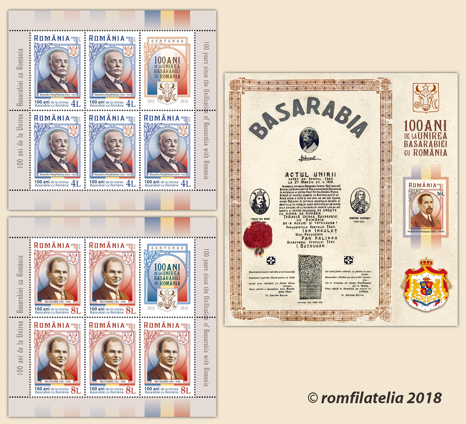 În anul Centenarului Marii Uniri, Romfilatelia celebrează revenirea românilor dintre Prut și Nistru în graniţele ţării, la 27 martie 1918, prin emisiunea de mărci poștale 100 ani de la Unirea Basarabiei cu România. Pe timbrele emisiunii sunt ilustrate trei personalităţi care au mijlocit înfăptuirea acestui ideal naţional. Astfel, pe timbrul cu valoarea nominală de 4 […]