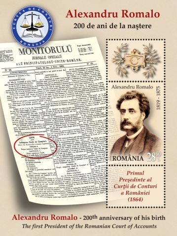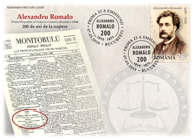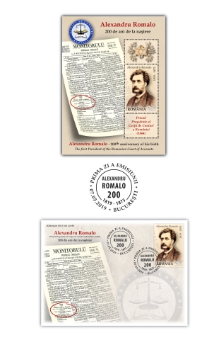Romfilatelia introduce în circulație la data de marți, 7 mai 2019, o emisiune aniversară de mărci poștale sub denumirea Alexandru Romalo, 200 de ani de la naștere, materializată sub forma unei colițe filatelice dantelate cu o marcă poștală a cărei valoare nominală este de 28,50 lei. Grafica alăturată imaginii mărcii poștale ilustrează în facsimil prima pagină a „Monitorului Oficial”, în care a fost publicată legea înființării Curții de Conturi a României și sigla actuală a acestei instituții.
