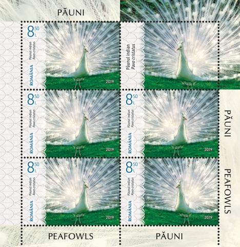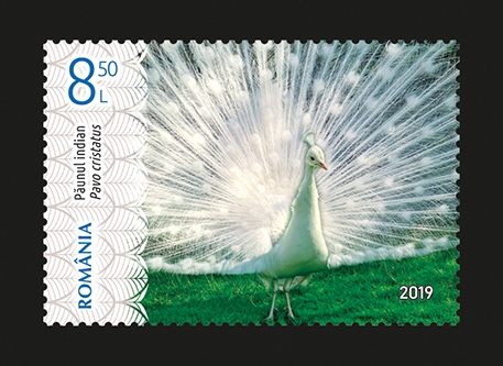 Păunul indian (Pavo cristatus) este de o frumusețe legendară, declarată pasărea națională a Indiei, cunoscută în două variante de culori: albastru și alb, subspecia fiind reprezentată pe al treilea și al patrulea timbru ale emisiunii, cu valorile nominale de 8,50 lei și 12 lei. Această subspecie face parte din familia păunilor (Phasianidae) și din ordinul Galliforme, provenind din zona Indiei.