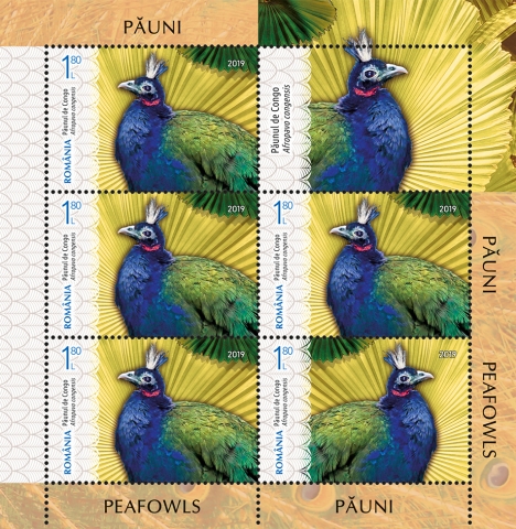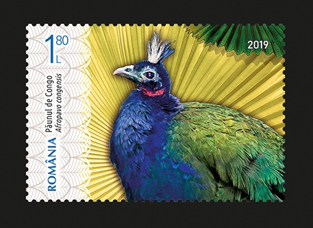 Păunul de Congo sau Păunul African (Afropavo congensis) este răspândit în pădurile tropicale ale fluviului Congo și este ilustrat pe primul timbru al emisiunii, cu valoarea nominală de 1,80 lei. Acest tip de păun are un aspect voluminos. Lungimea masculului este de până la 70 de cm, cu o coadă scurtă care măsoară între 23-26 cm iar femelele au dimensiuni între 60-63 de cm,cu o coadă cu dimensiuni între 195 și 225 cm. Diferența de greutate între sexe este considerabilă, masculii cântărind 1475 g, iar femelele, 1154 g.