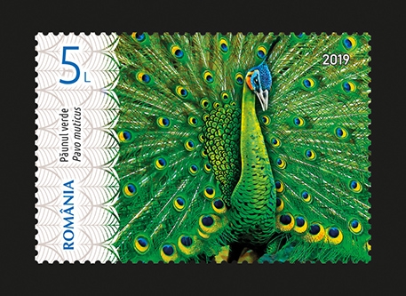 Păunul verde (Pavo muticus) face parte din familia păunilor (Phasianidae), ordinul Galliformes, fiind originar din India, Sri Lanka, Pakistan, Bhutan, Bangladesh sau Nepal și este reprezentat pe al doilea timbru al emisiunii, cu valoarea nominală de 5 lei.