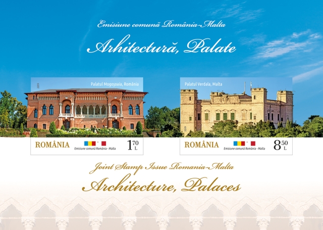 Romfilatelia introduce în circulație pe data de luni, 14 octombrie a.c. emisiunea comună de mărci poștale România-Malta intitulată „Arhitectură, Palate”, ilustrând Palatul Mogoșoaia din România și Palatul Verdala din Malta.