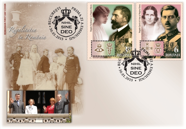 În aceste momente istorice, Romfilatelia s-a alăturat Casei Regale, iar pe această cale, dorim să amintim o parte din temele dedicate istoriei regalităţii, în anul 2015, prin emisiunea de mărci poştale ”Regalitatea în România”, timbrele ilustrând cele patru cupluri regale din istoria monarhiei române.