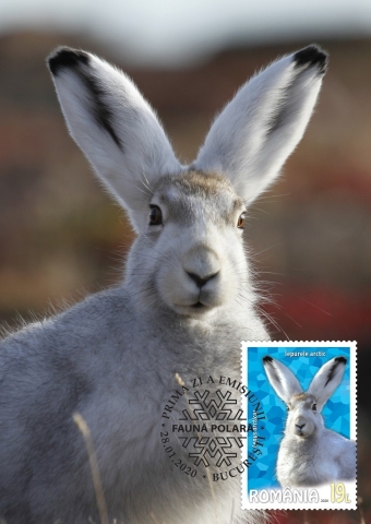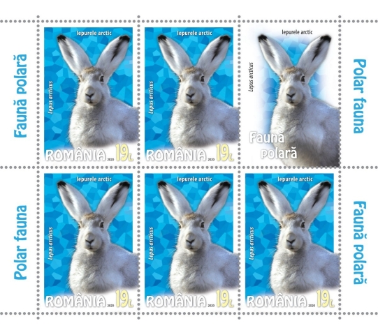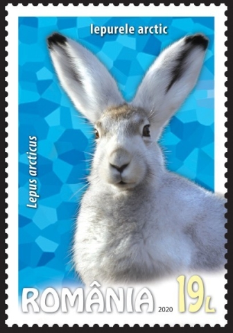 Iepurele arctic (Lepus arcticus) sau iepurele polar, ilustrat pe timbrul cu valoarea nominală de 19 lei, este o specie adaptată în mare măsură la habitatul rece, montan. În trecut, era considerată a fi o subspecie a iepurelui montan, însă oamenii de știință au decis că trebuie privită ca o specie separată.