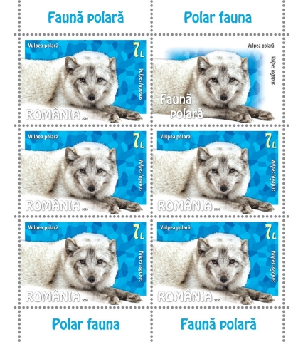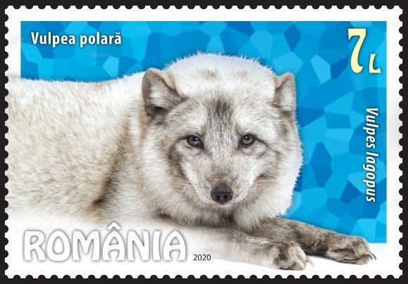 Vulpea polară (Vulpes lagopus), a cărei imagine este reprodusă pe timbrul cu valoarea de 7 Lei, este un animal carnivor, din ordinul Carnivora, familia Canidae. Vulpea polară trăiește în regiunile polare de tundră. Animalul este adaptat la clima rece, având o blană deasă, iar talpa labelor fiind acoperită cu blană. Lungimea vulpilor este între 65 și 90 de cm, având înălțimea de circa 30 cm și o greutate de 5 kg. Femelele sunt aproape la fel de mari ca masculii. Vulpile polare au botul și urechile scurte. Culoarea vulpilor diferă după anotimp, vara având culoarea blănii neagră pe spate, cu picioarele de culoare brună, pe când iarna, culoarea este de camuflaj, albă sau alb-cenușie. Blana deasă le permite să supraviețuiască la temperaturi foarte scăzute.