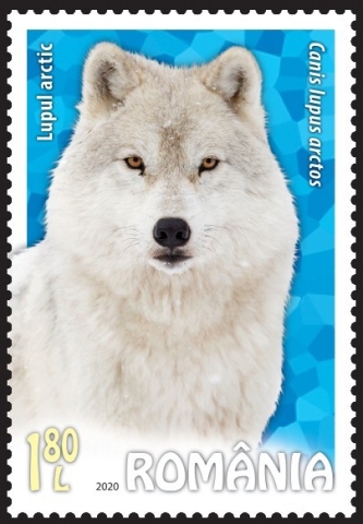 Lupul arctic (Canis lupus arctos), redat grafic pe timbrul cu valoarea de 1,80 Lei, face parte din familia Canidae şi este o subspecie a lupului care trăiește în partea septentrională a Americii de Nord. Subspecia echivalentă din nordul Asiei este lupul siberian (Canis lupus albus). Se distinge prin blana sa albă. Începând cu anul 1930, s-a constatat o scădere a dimensiunii craniului acestei specii, probabil din cauza încrucișării cu câinii domestici. Culoarea blănii asigură un bun camuflaj în zăpadă. Are 63-79 cm în înălțime la greabăn. Cântărește aproximativ 45 de kg și este de până la 1,5 m în lungime.
