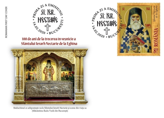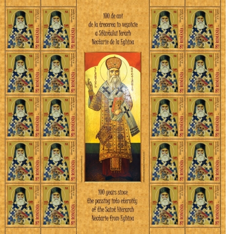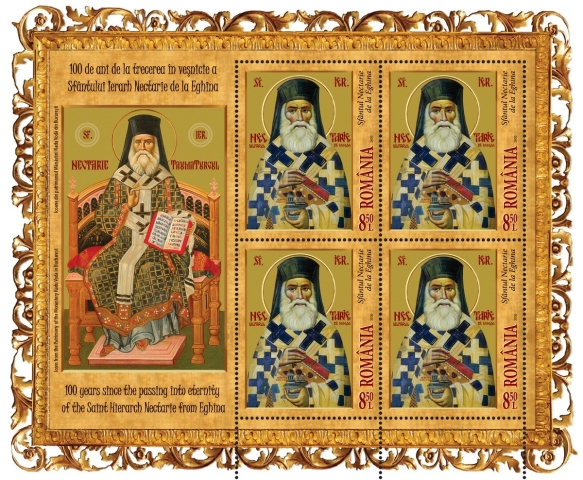 Romfilatelia introduce în circulație vineri, 14 februarie a.c., emisiunea de mărci poștale intitulată 100 de ani de la trecerea în veșnicie a Sfântului Ierarh Nectarie de la Eghina.