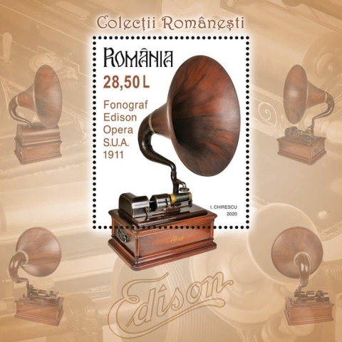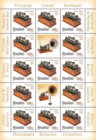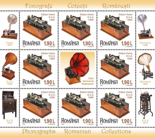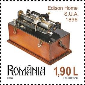 Edison Home Phonograph se regăsește pe timbrul cu valoarea nominală de 1,90 lei. Acest model de fonograf a fost creat spre sfârșitul anului 1896 și a fost un aparat de succes. Înregistrarea sunetului pentru acest aparat se făcea cu ajutorul cilindrilor de ceară. Avantajul acestor cilindri făcuți de compania lui Edison consta în faptul că puteau fi refolosiți. În Marea Britanie, fonografele au fost vândute de compania Edison Bell, însărcinată atât cu producerea aparatelor și comercializarea lor, precum și cu păstrarea patentelor.