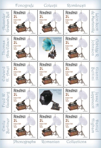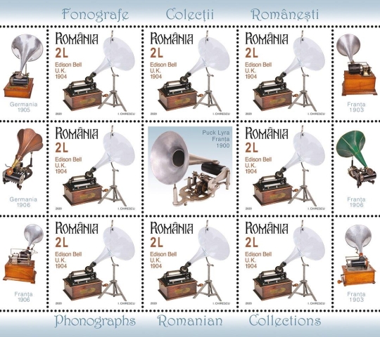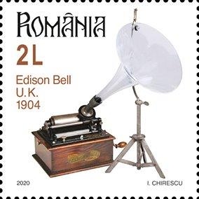 Pe timbrul cu valoarea nominală de 2 lei este ilustrat grafic un exemplar de Fonograf Edison Bell cu pâlnie de sticlă. Ce este cu adevărat remarcabil la acest fonograf este pâlnia sa de sticlă. Sunetul pe care îl redă este unul deosebit, iar faptul că pâlnia este intactă face din această piesă una foarte rară.