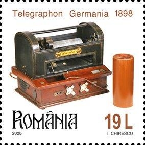 Pe timbrul cu valoarea nominală de 19 lei s-a ilustrat fonograful Telegraphon. Acest dispozitiv de înregistrare este, de fapt, primul aparat care folosea principii magnetice pentru înregistrarea sunetului. Patentat în anul 1898 de către Valdemar Poulsen, un inginer din Danemarca, aparatul a ajuns să fie foarte rar astăzi. Acesta folosea cilindri de ceară de dimensiuni foarte mari, iar scopul lor era pentru a înregistra mesaje, chiar și mesaje telefonice, fiind precursorul robotului telefonic. La Expoziția Universală din anul 1900 de la Paris, Poulsen a înregistrat cu un aparatul său vocea împăratului Austriei, Franz Josef.