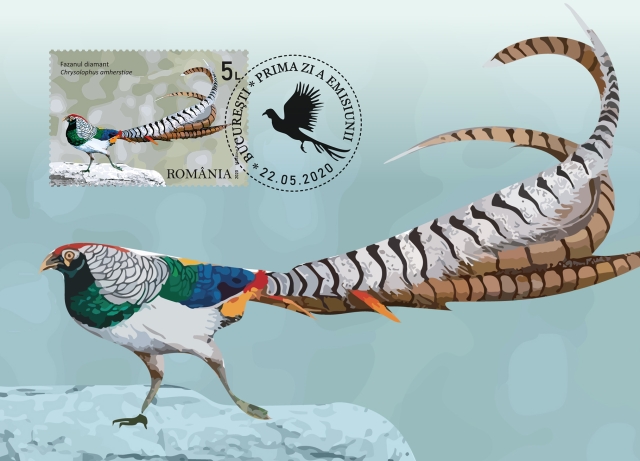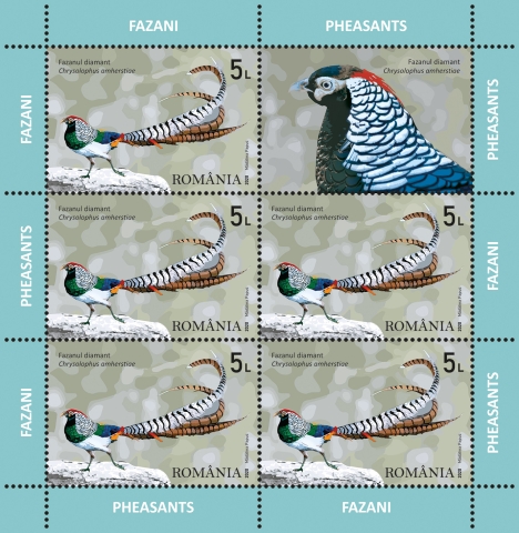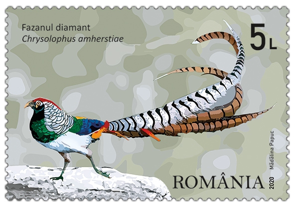 Fazanul diamant – Chrysolophus amherstiae (Leadbeater, 1829), ilustrat pe timbrul cu valoarea nominală de 5 lei, trăiește în zonele înalte din Asia, în sud-vestul Chinei și Myanmar, unde populează versanții munților la altitudini cuprinse între 2000 m și 3500 m altitudine, ajungând în unele zone înalte ale Tibetului și până la 6000 m altitudine. Biotopul preferat este reprezentat de desișurile și pădurile de bambus. Penajul masculului este deosebit de frumos. Are un guler alb în jurul gâtului și o coadă foarte lungă, ale cărei pene ornamentale pot ajunge până la un metru.