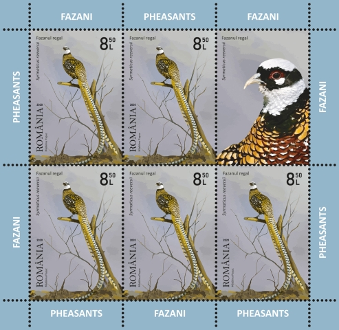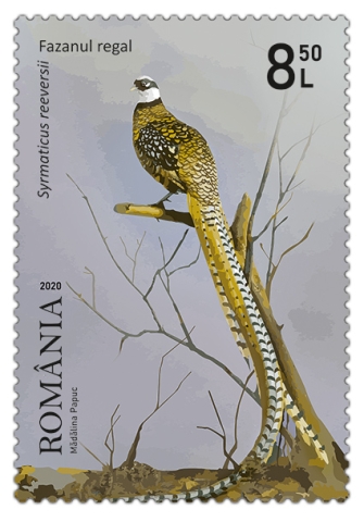 Fazanul regal – Syrmaticus reeversii (Gray, 1829), reprezentat pe timbrul cu valoarea nominală de 8,50 lei, populează stepele și semi-deșerturile din centrul și nord-estul Asiei, și anume în nordul Afghanistanului, nord-estul Chinei, Kașmir, Iran, Kazahstan, Kârgâzstan, Mongolia, Pakistan, Rusia, Turkmenistan și Uzbekistan. Penajul este strălucitor, auriu-solzat la mascul, a cărui coadă colorată în nuanțe de galben cu alb și negru poate atinge 2 m lungime.