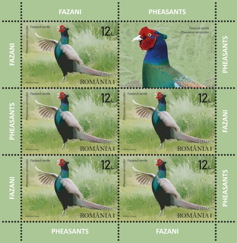 Fazanul verde sau fazanul japonez Phasianus versicolor Vieillot, 1825, reprezentat pe timbrul cu valoarea nominală de 12 lei, este după unele surse o subspecie a fazanului comun, în timp ce altele îl separă ca specie distinctă. Masculul are un penaj caracteristic verzui întunecat, în timp ce femela este mai mică și mai puțin intens colorată.