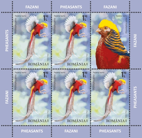 Fazanul auriu – Chrysolophus pictus (Linnaeus, 1758), redat pe timbrul cu valoarea nominală de 1,90 lei, este originar din Asia, Mongolia și centrul Chinei, unde trăiește în zone împădurite. Ca specie ornamentală a fost introdus în Europa în secolul al XV-lea, în principal datorită penajului masculilor, deosebit de frumos. Podoabele cele mai alese sunt coroana aurie, care acoperă creștetul, un guler impresionant, pe care posesorul îl poate înfoia în timpul dansului nupțial, pentru a impresiona femela și o coadă lungă de aproape un metru. Din punct de vedere al statutului de ocrotire, fazanul auriu este încadrat pe Lista Roșie Internațională a Uniunii Internaționale pentru Conservarea Naturii (IUCN) la categoria preocupare minimă (LC).