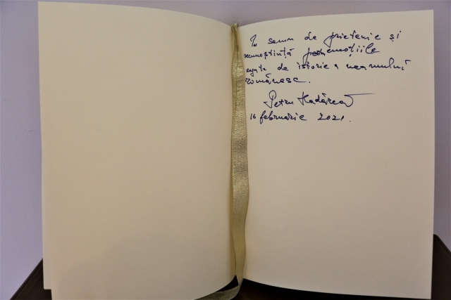 În încheierea vizitei, domnul Hadârcă a avut amabilitatea de a lăsa echipei Romfilatelia un mesaj în Cartea de Onoare: „În semn de recunoștință pentru emoțile legate de istoria neamului românesc.”