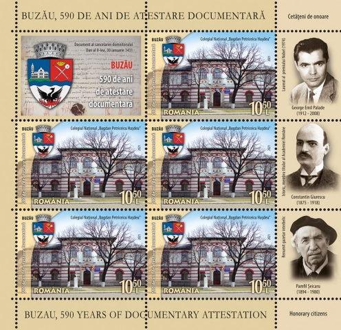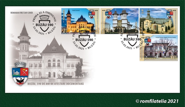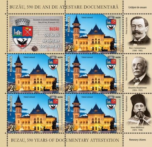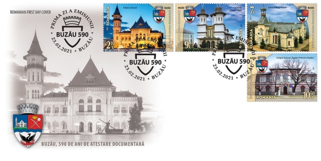 Romfilatelia introduce în circulație marți, 23 februarie a.c., o emisiune de mărci poștale tematică din seria Orașele României, intitulată Buzău, 590 de ani de atestare documentară.