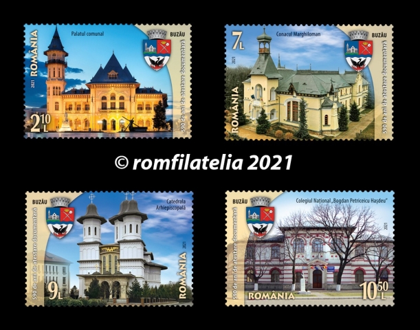 Emisiunea de mărci poștale aniversară dedicată Buzăului reproduce în imaginile sale patru monumente arhitectonice reprezentative legate strâns de istoria, cultura și viața socială a orașului.