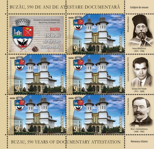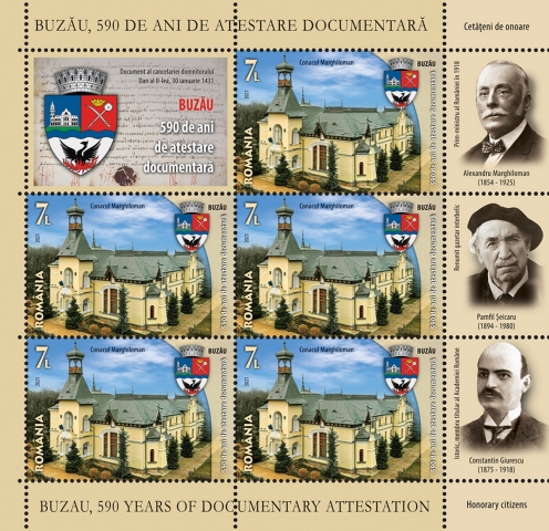 Romfilatelia mulțumește Primăriei Municipiului Buzău pentru sprijinul documentar acordat la realizarea acestei emisiuni de mărci poștale.