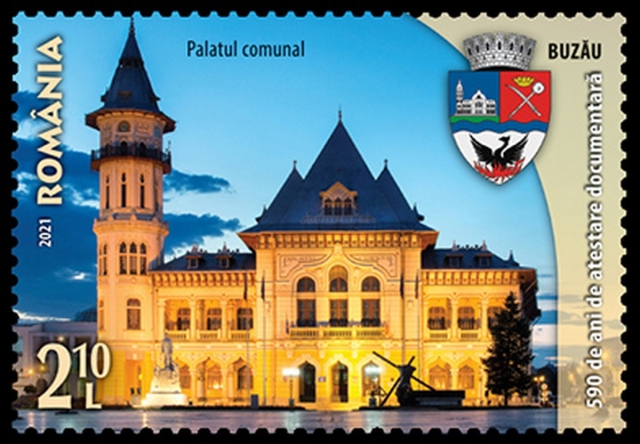 Pe timbrul cu valoarea nominală de 2,10 lei este ilustrat Palatul Comunal, aflat în centrul orașului Buzău, fiind sediul actual al Primăriei și al Consiliului Local. A fost edificat în perioada 1899-1903 la comanda primarului orașului, Nicu Constantinescu, după proiectul arhitectului Alexandru Săvulescu. Inaugurarea clădirii, cu destinația de palat administrativ, a avut loc în anul 1903, în prezența regelui Carol I și a principelui Ferdinand. Combinând elemente neoromânești cu motive arhitecturale locale (regăsite la casele boierești), la care se adaugă forme decorative ce fac trimitere la vița-de-vie (prezență majoră pe plaiurile buzoiene), arhitectul Săvulescu a realizat una dintre creațiile lui de referință în domeniu. După distrugerile provocate de bombardamentele aliaților și luptele dintre soldații sovietici și germani în august 1944, Palatul a fost reconstruit începând cu anul 1947.