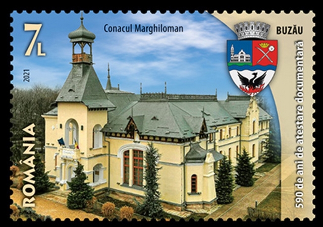Conacul Marghiloman, a cărui imagine este reprodusă pe timbrul cu valoarea nominală de 7 lei, este un ansamblu arhitectonic reprezentativ al orașului Buzău. Cunoscut drept Palatul Marghiloman, construit în a doua jumătate a sec. al XIX-lea, de către Iancu Marghiloman, fost primar al Buzăului și un mare latifundiar. După ce acesta a murit, fiul său, Alexandru Marghiloman, a hotărât să modernizeze ansamblul, apelând la serviciile renumitului arhitect Paul Gottereau. Începând cu anul 2011, valorosul ansamblu arhitectonic a fost restaurat, devenind Centrul Cultural ,,Alexandru Marghiloman”, unde se desfășoară diverse activități culturale cu caracter intern și internațional.