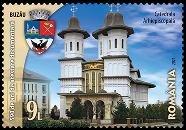 Pe timbrul cu valoarea nominală de 9 lei este redată Catedrala Arhiepiscopală. Actualul edificiu al Catedralei Arhiepiscopale a fost ridicat la inițiativa arhiepiscopului Epifanie, între anii 2002 și 2009, după tipicul bisericilor creștine românești, fiind compartimentată în pronaos, naos și altar. Pictura realizată în tehnica frescei este opera pictorului Petre Brașoveanu din Buzău. La 8 noiembrie 2009, în prezența Preafericitului Părinte Daniel, a fost oficiată slujba de sfințire a lăcașului de cult, cel mai important din Arhiepiscopia Buzăului și Vrancei.