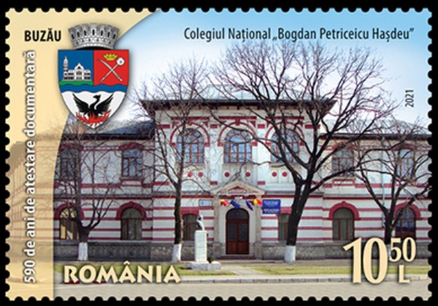 Colegiul Național „Bogdan Petriceicu Hașdeu”, ilustrat pe timbrul cu valoarea nominală de 10,50 lei, este cea mai importantă instituție de învățământ liceal din Buzău, înființată în anul 1867, având ca sediu o construcție ridicată pe un teren al Mănăstirii Banului. Până în anul 1875 a ființat sub numele de Gimnaziul „Tudor Vladimirescu”. Începând cu 1932, poartă numele lui Bogdan Petriceicu Hașdeu.