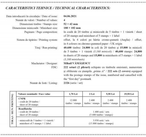 Emisiunea va fi disponibilă începând de vineri 4 iunie 2021, în magazinele Romfilatelia din București, Bacău, Brașov, Cluj-Napoca, Iași, Timișoara, precum și în magazinul nostru online: http://romfilatelia.ro/store/. Emisiunea este completată de două plicuri „prima zi”, coală de 20 timbre și minicoală de 5 timbre + 1 vinietă.