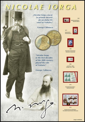 Romfilatelia s-a alăturat evenimentelor dedicate aniversării a 150 de ani de nașterea istoricului Nicolae Iorga, membru titular al Academiei Române și Preşedinte al Secţiunii de Istorie (1924-1927), figură emblematică a vieții românești din secolul XX, teoretician al istoriei, medievist de prestigiu, promotor al istoriografiei și al studiilor sud-est europene, traducător, scriitor, jurnalist, diplomat și om politic, Iorga contribuind în mod decisiv la consolidarea unităţii culturale a românilor din toate teritoriile.