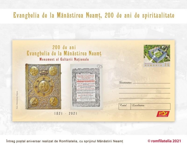 Romfilatelia s-a alăturat manifestărilor spiritual-științifice organizate de către Mănăstirea Neamț luni, 12 iulie a.c., cu ocazia împlinirii a 200 de ani de la tipărirea “Evangheliei de la Neamț”, cea dintâi ediție românească ilustrată, prin lansarea unui întreg poștal aniversar: “Evanghelia de la Mănăstirea Neamț, 200 de ani de spiritualitate”.