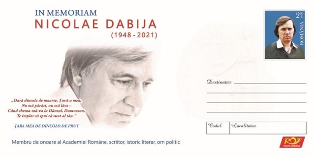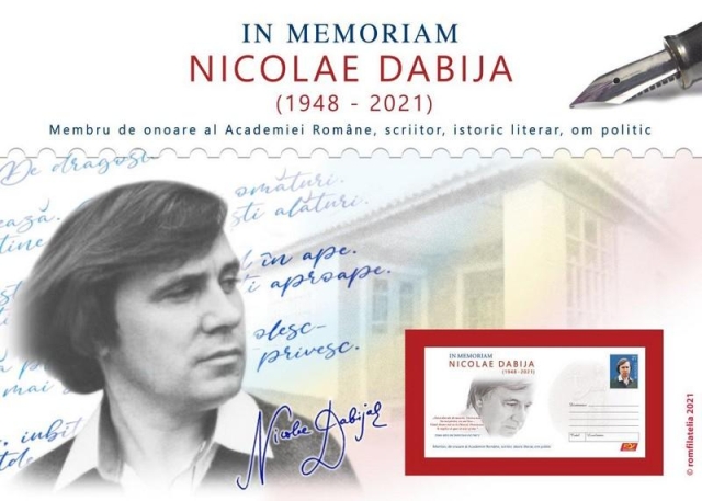 Romfilatelia i-a dedicat cu această ocazie un întreg poștal cu timbru marcă fixă, prezentat intr-o mapă specială al cărui cuvânt înainte a fost scris de către Acad. Eugen Simion, Președintele Fundației Naționale pentru Știință și Artă: ”Nicolae Dabija a fost de la început și a rămas până la sfârșit un poet angajat în istorie (în sens pozitiv, înalt liric), un poet complex cu o imaginație bogată și o determinare în tot ceea ce scrie, care, mie, mi-a plăcut și îmi place.”