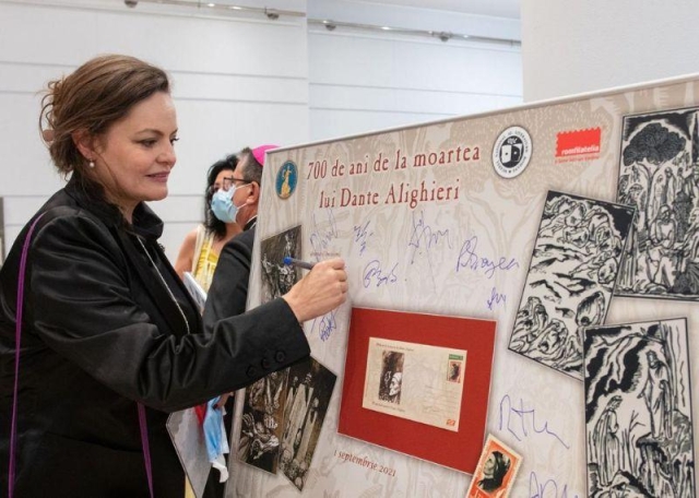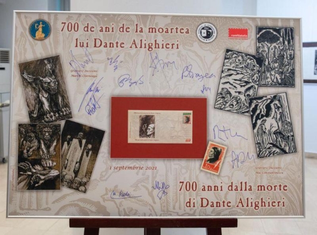 Romfilatelia a fost prezentă astăzi la vernisajul expoziției dedicate celor 700 de ani de la moartea lui Dante Aligheri, eveniment organizat în parteneriat cu Academia Română si Muzeul Național al Literaturii Române, prin prezentarea emisiunii filatelice dedicate marelui poet florentin.