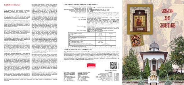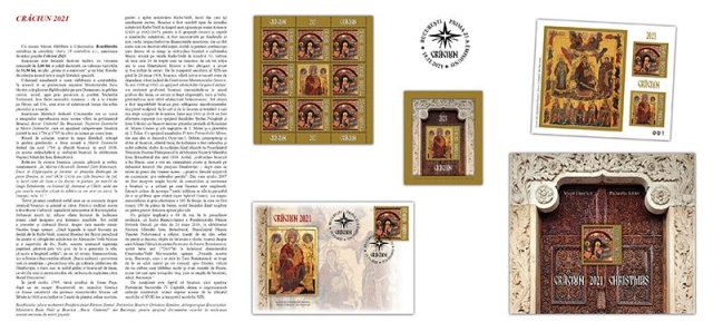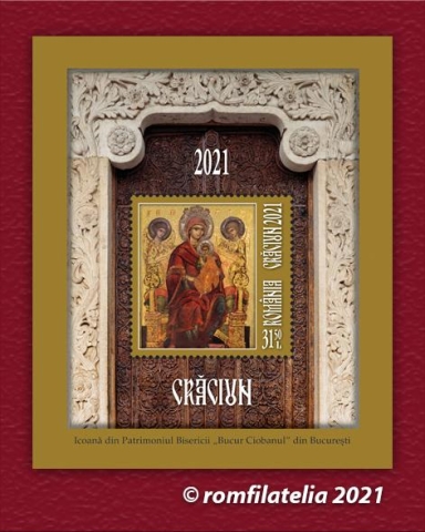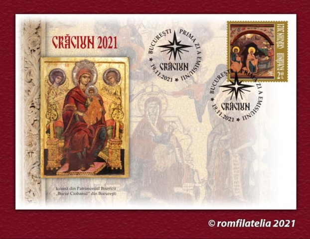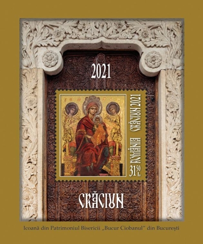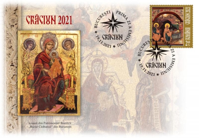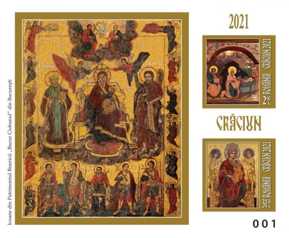 Emisiunea filatelică dedicată Crăciunului are ca sursă a imaginilor reproducerea unor icoane aflate în patrimoniul Bisericii Bucur Ciobanul din București: Nașterea Domnului și Maica Domnului, care au aparținut catapetesmei bisericii pictată în anii 1704 și 1705 de către un iconar pe nume Ioan.
