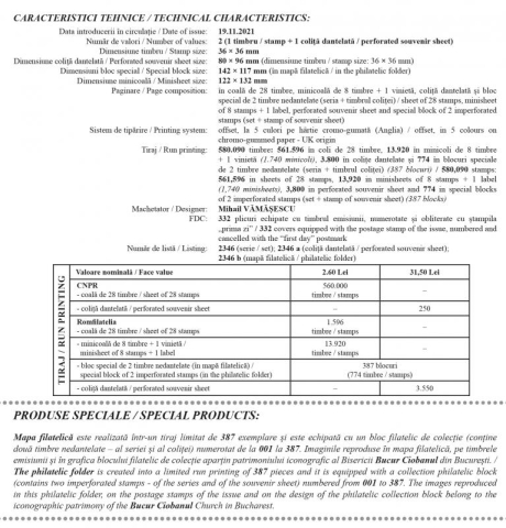 Emisiuni de mărci poștale, care va fi disponibilă începând de vineri, 19 noiembrie 2021, în magazinele Romfilatelia din București, Bacău, Brașov, Cluj-Napoca, Iași, Timișoara, precum și în magazinul nostru online: http://romfilatelia.ro/store/.