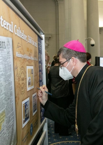 Într-o atmosferă solemnă a fost prezentat panoul filatelic, document de valoare al acestei aniversări, pe care au semnat conducătorii și reprezentanții cultelor religioase din România, personalități ale politicii românești, demnitari din cadrul autorităților centrale ale statului Român, prieteni și iubitori ai filateliei.