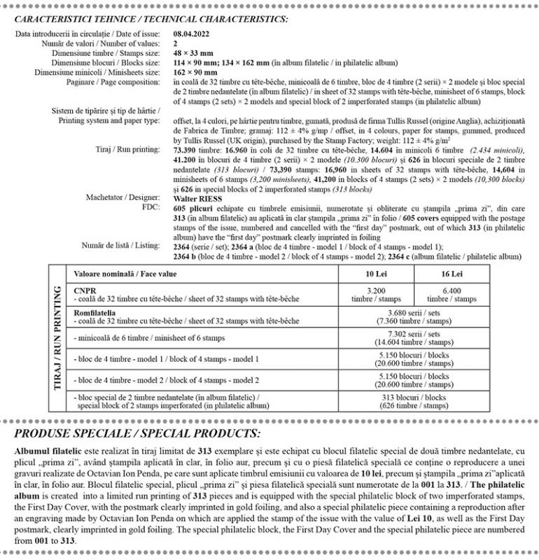 Emisiunea, alcătuită din două mărci poștale (cu valorile nominale de 10 lei și 16 lei), două blocuri dantelate, două minicoli, un plic „prima zi” și un album filatelic emisiunea va fi introdusă în circulație vineri, 8 aprilie a.c.