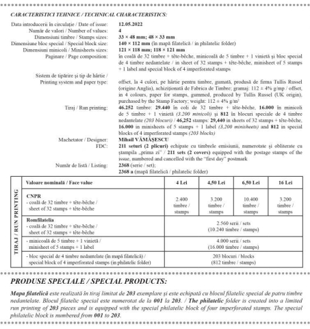 Emisiunea filatelică va fi disponibilă începând de joi, 12 mai 2022, în magazinele Romfilatelia din București, Bacău, Brașov, Cluj-Napoca, Iași, Timișoara, precum și în magazinul nostru online: http://romfilatelia.ro/store/.