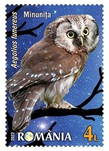 Minunița (Aegolius funereus), ilustrată pe timbrul cu valoarea nominală de 4 Lei, este caracteristică zonelor împădurite de conifere, dar este prezentă și în cele de amestec cu foioase.