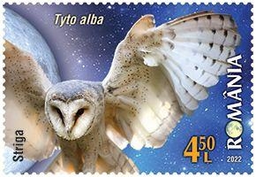 Striga (Tyto alba), redată pe timbrul cu valoarea nominală de 4,50 Lei, este o specie de pasăre răpitoare de noapte de talie medie.
