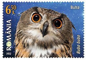 Buha (Bubo bubo), ilustrată pe timbrul cu valoarea nominală de 6,50 Lei, este cea mai mare specie dintre răpitoarele de noapte din Europa.