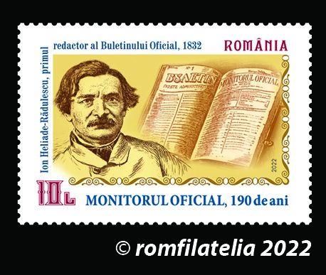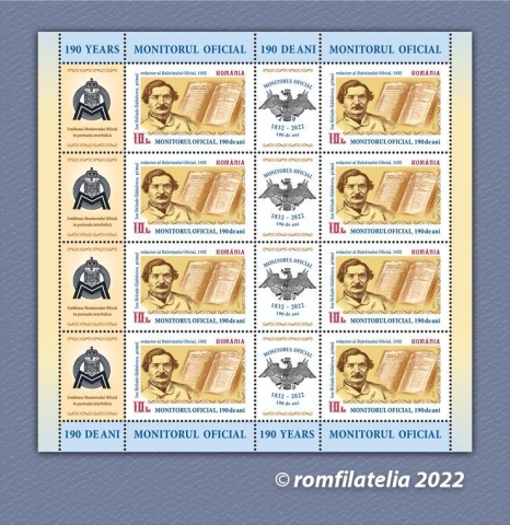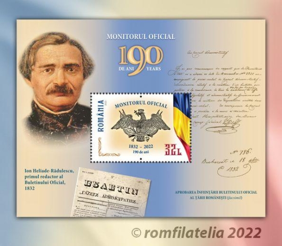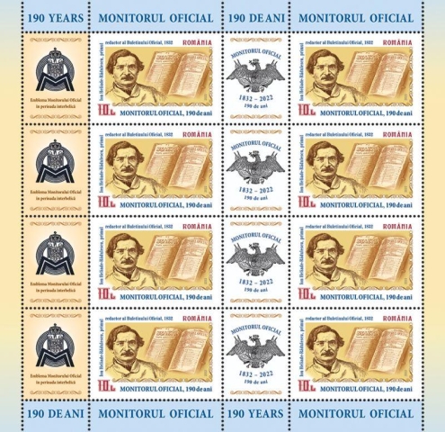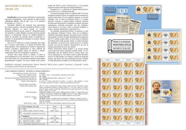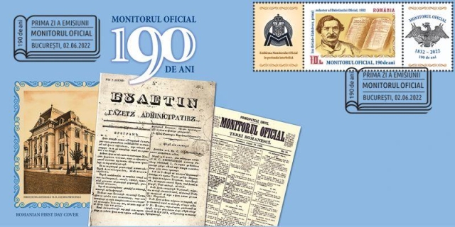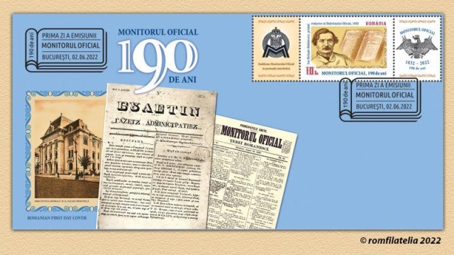 Romfilatelia înscrie în tematica filatelică a evenimentelor aniversare instituționale o nouă emisiune de mărci poștale „Monitorul Oficial, 190 de ani” care va fi introdusă în circulație joi, 2 iunie a.c.