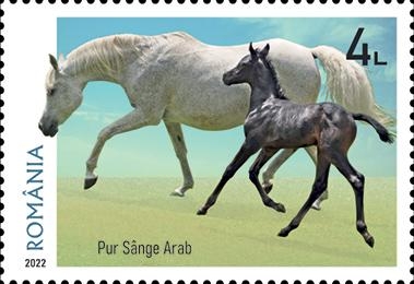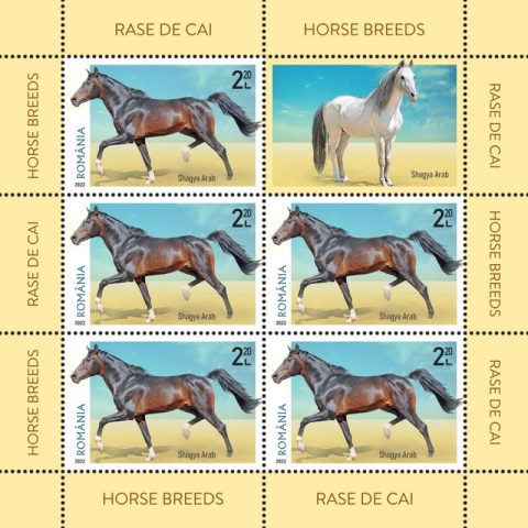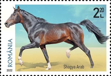 Shagya Arab, este ilustrat pe timbrul cu valoarea nominală de 2,20 Lei. Rasa a fost concepută în zona Bucovinei secolului al XVIII-lea în Imperiul Austro-Ungar, când a luat fiinţă Herghelia Rădăuţi, şi a pornit de la un fundament genetic de Pur Sânge Arab.