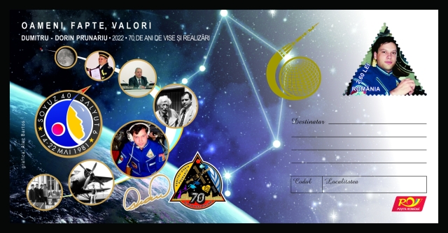 Romfilatelia, susținătoare continuă a proiectelor și inițiativelor promotoare de valori din domeniul culturii și al științei, s-a alăturat evenimentului, dedicând, singurului român care a zburat în spațiul cosmic, un întreg poștal cu timbru marcă fixă, intitulat „Oameni, Fapte, Valori: Dumitru-Dorin Prunariu, 70 de ani de vise și realizări”, macheta plicului fiind realizată de graficianul Alec Bartos.