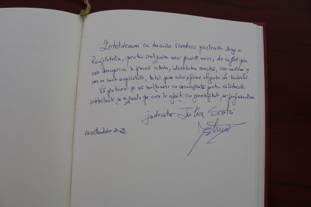 Doamna judecător în cadrul Curții Constituționale a României a avut amabilitatea să semneze în cartea de onoare Romfilatelia, având următorul mesaj: „Întotdeauna cu bucuria revederii prietenilor dragi ai Romfilatelia, pentru realizarea unor proiecte unice, de suflet prin care descoperim împreună istoria, identitatea noastră, cine suntem și care ne sunt aspirațiile, totul prin culori și forme elegante ale timbrelor. Vă prețuiesc și vă mulțumesc cu recunosștință pentru călătoriile intelectuale și vizuale pe care le oferiți cu generozitate și profesionalism.”