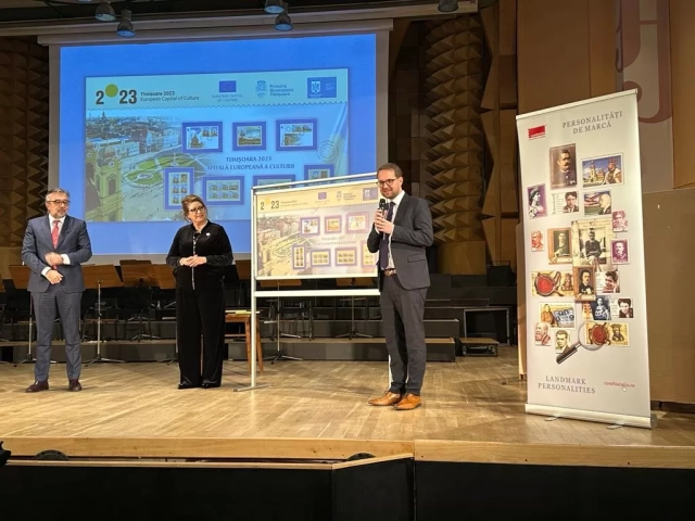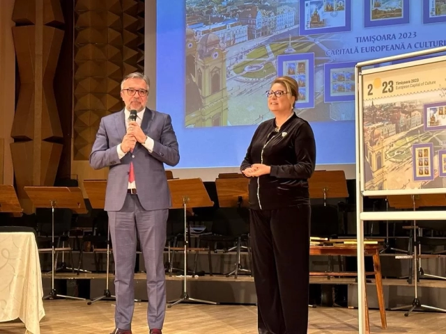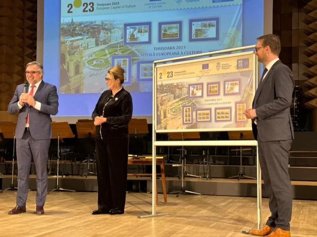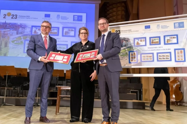 Romfilatelia a lansat în sala Filarmonicii Banatul, în avanpremiera concertului inaugural, emisiunea de mărci poștale intitulată „Timișoara 2023, Capitală Europeană a Culturii”, în prezența ministrului Culturii, Lucian Romașcanu si a Primarului Dominic Fritz.