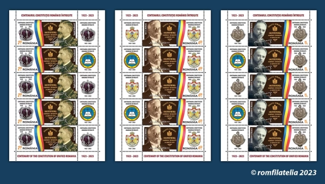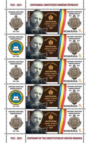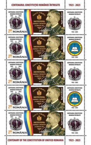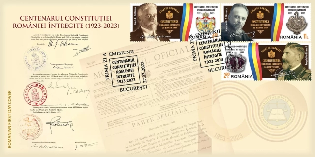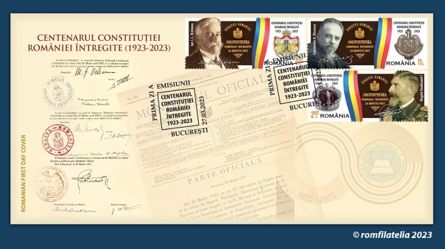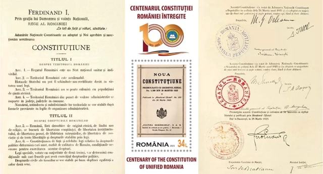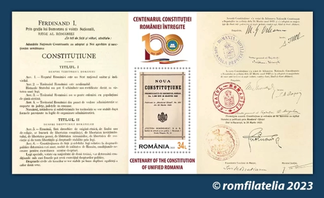 Pentru a marca acest eveniment istoric, Romfilatelia va introduce în circulație luni, 27 martie emisiunea de mărci poștale intitulată Centenarul Constituției României Întregite, alcătuită din 3 timbre și o coliță dantelată, precum și un plic prima zi.
